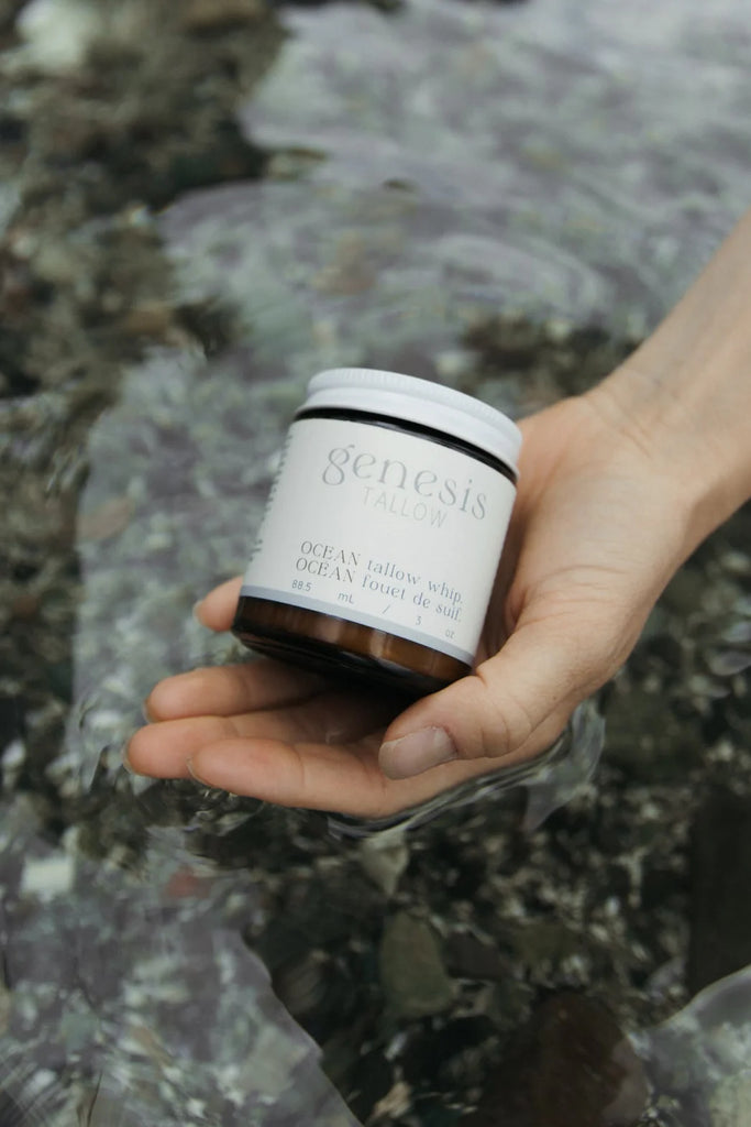 Ocean Tallow Whip Close your eyes, and let the salty Pacific Ocean spray blow through the forest, and find you. Genesis Tallow is handcrafted with only the best quality grass fed/finished beef tallow, and whipped into a spreadable mousse for a smooth and velvety application. This unique frothing method ensures your skin absorbs your tallow more quickly and evenly.