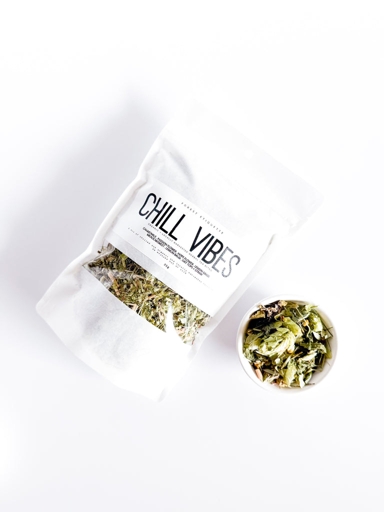 CHILL VIBES is a herbal tea blend made from a variety of organic, locally harvested, and sustainably wild gathered nervine and adaptogen plants chosen for their ability to gently down shift and regulate the nervous system, relax the body, and lighten the feel of the mind. Nervine relaxant herbs like lemon balm, oat straw, golden poppy, pineapple weed, and passionflower dance with adaptogen herbs like Rama tulsi, and gotu kola, to the flavourful beat lemon grass, ginger root, held stead fast by the steady and nutritive qualities of stinging nettle and blueberry leaf.